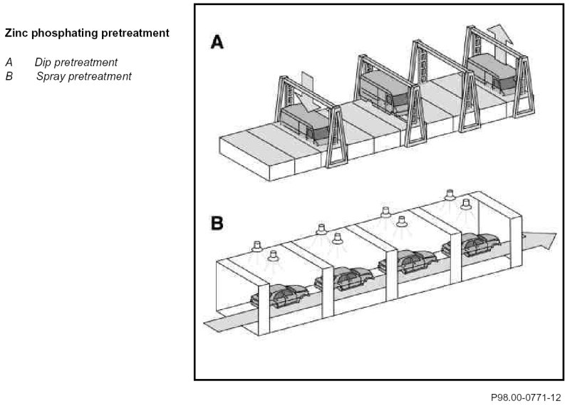 Before phosphatizing, the body-in-white is degreased with a mild alkaline diluted solution, cleaned and rinsed with demineralized water.