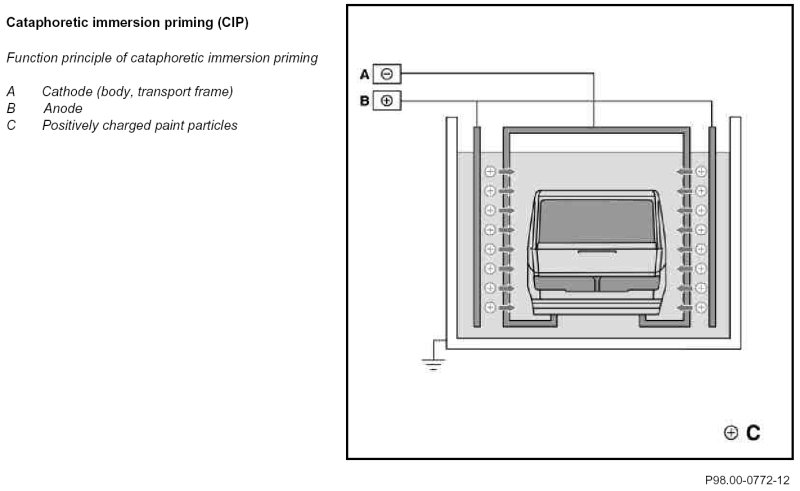 With cataphoretic immersion priming the phosphatized bodies and detachable body parts are lowered into an immersion bath with water-thinnable primer. By immersing the body at a special set angle (and due to the so-called hole pattern in the bodies) air bubbles in cavities are avoided and an optimum coating of the cavity is ensured. An electric field is produced between the body and the immersion bath. The positively charged paint particles (anode) deposit themselves on the negatively charged body (cathode).