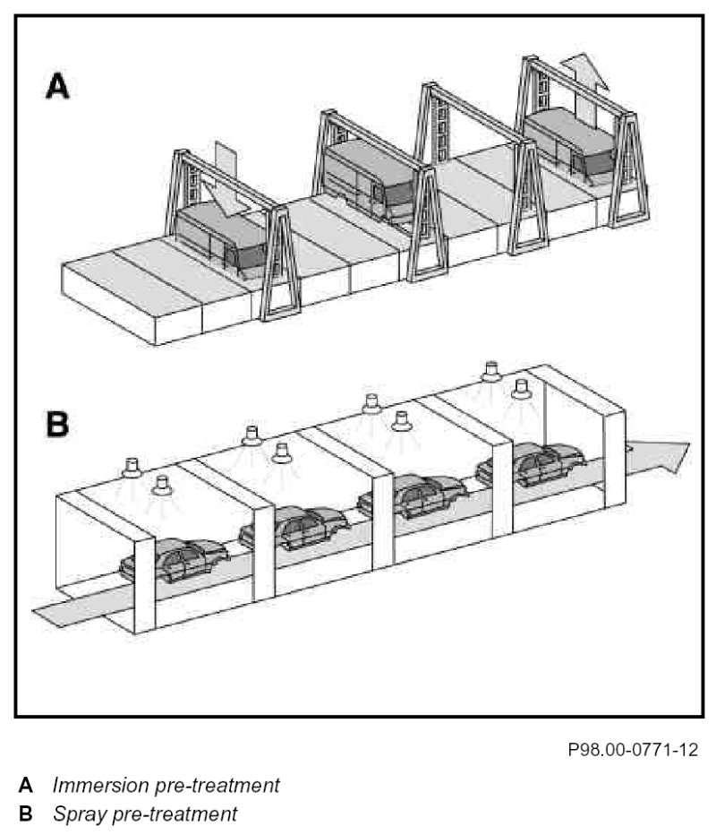 Before phosphatizing, the body-in-white is degreased with a mild alkaline diluted solution then cleaned and rinsed with demineralized water.