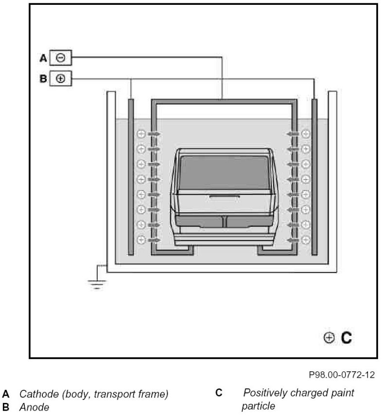 With cataphoretic immersion priming the phosphatized bodies and detachable body parts are lowered into an immersion bath with waterbased primer. By immersing the body at a special set angle, and due to the hole pattern in the body, air bubbles in cavities are avoided and an optimum coating of the cavity is achieved. An electric field is produced between the body and the immersion bath. The positively charged paint particles (anode) deposit themselves on the negatively charged body (cathode). The separation voltage and coating period (dwell time in immersion bath) are selected so that there is an even film of paint on the body and in its cavities. Once the bodies are moved out of the bath, the loose primer material is rinsed off with ultrafiltrate and demineralized water. The special advantage of cataphoretic immersion priming is the even coating in inaccessible areas such as cavities, corners and edges. With this process, the use of solvents which are hazardous to health and harmful to the environment can be greatly reduced.