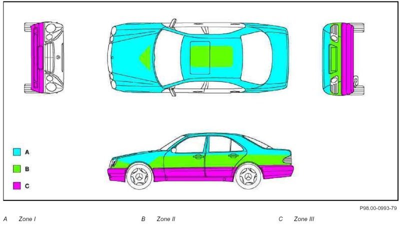 All other interior areas are included in zone III, such as: entire engine compartment, radiator cross member, engine hood channel, fender channel, trunk lid channel, engine hood, trunk lid and trunk interior.