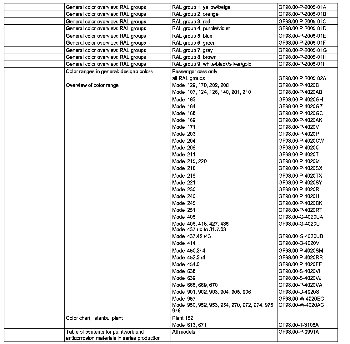 The following color charts represent passenger car and cross-country vehicle color shades painted since 1963, sorted according to RAL groups. Due to the large number of color shades in the commercial vehicle area (approx. 3000) a list is not shown here.