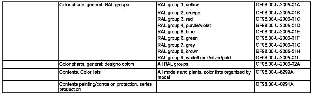 The following color charts represent passenger car color shades painted since 1963, sorted by RAL groups.