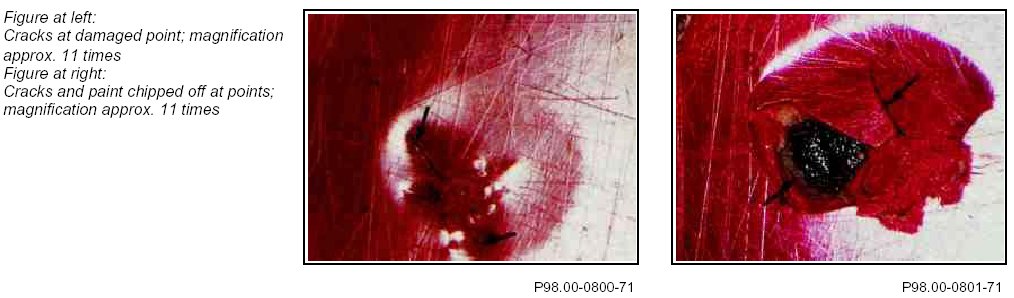 e. In the event of mechanical damage - e.g. stone impact - where the top coat has not yet chipped off, cracks are visible at the damaged point under a microscope/magnifying glass! The damage illustrations below show this clearly.