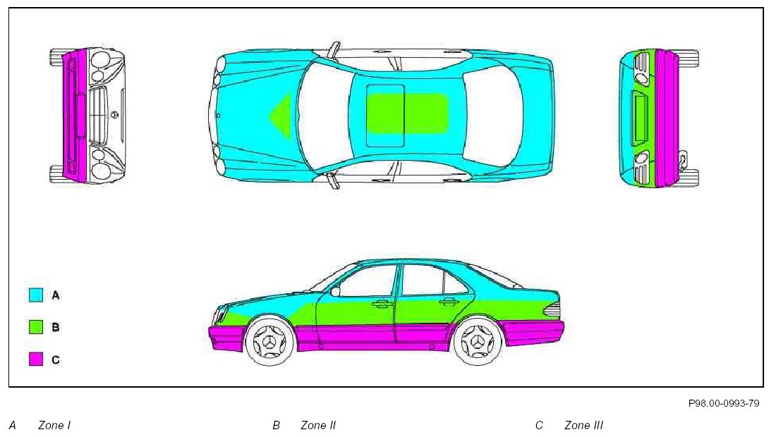 All other interior areas are included in zone III, such as: entire engine compartment, radiator cross member, engine hood channel, fender channel, trunk lid channel, engine hood, trunk lid and trunk interior.
