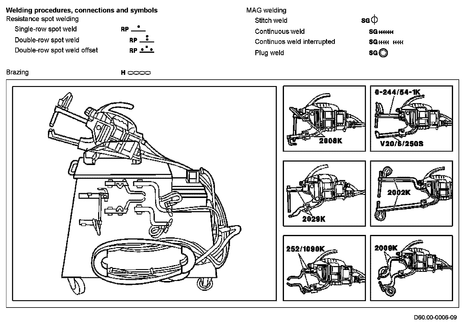 When spot welding, maintain a spot weld interval of approx. 20 mm. Clean, smooth electrode tips are required. Set the current time or power according to the sheet metal thickness (new part) on the spot welder.