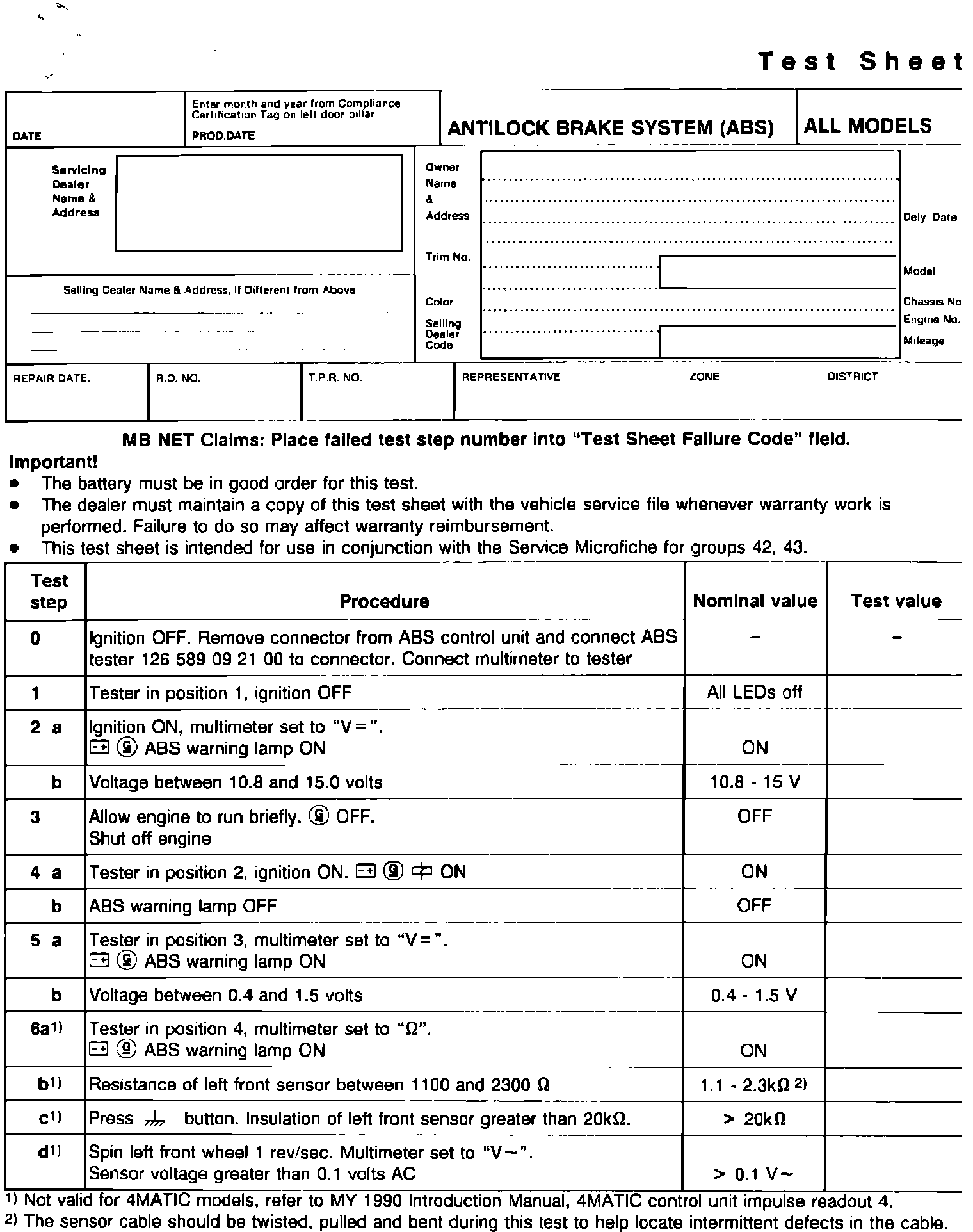 Attached is a copy of the new test sheet for the anti-lock brake system (ABS) MBNA/MBC 2405. This test sheet MUST be completed for every ABS test perfomed, and retained in the Dealer's vehicle service file.