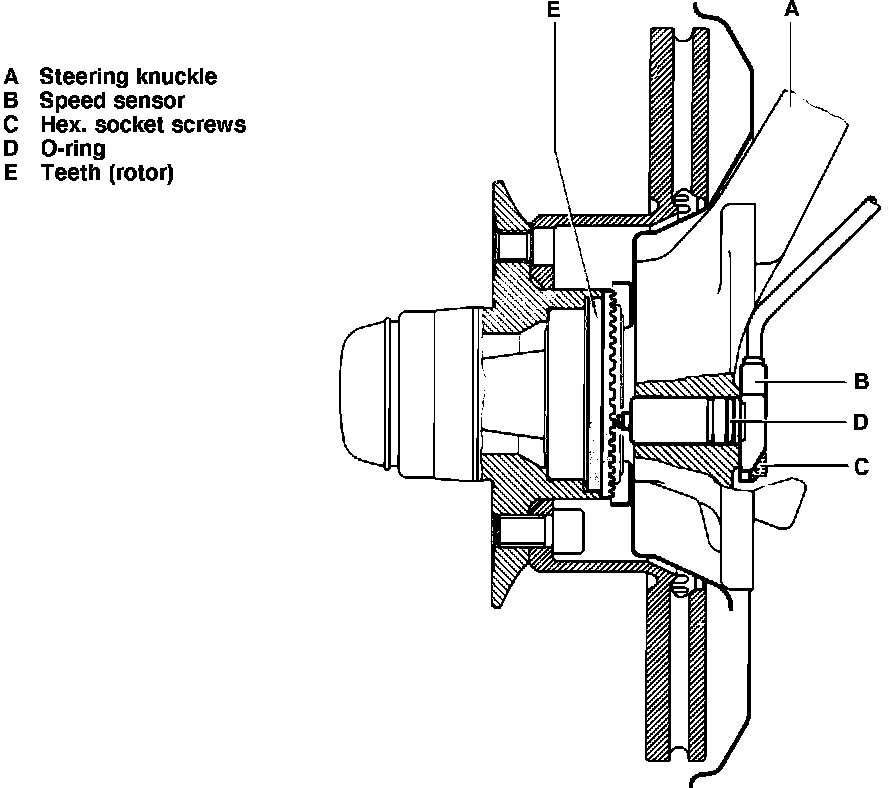 1. Replace O-ring on rpm sensor, mount rpm sensor on steering knuckle, making sure that the O-ring is not damaged and that rpm sensor rests with its flange against steering knuckle. Do not use force.