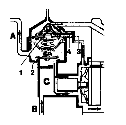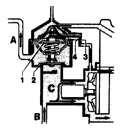 The main valve (1) is closed up to a coolant temperature of approx. 84 °C and interrupts the coolant flow towards the radiator (A) and through the bypass duct (C). Only a small quantity of coolant will flow through the control bore (3) to the coolant pump during the warming-up period. This design provides faster heating of the engine during the warming-up period, especially in the combustion chamber region in the cylinder head.