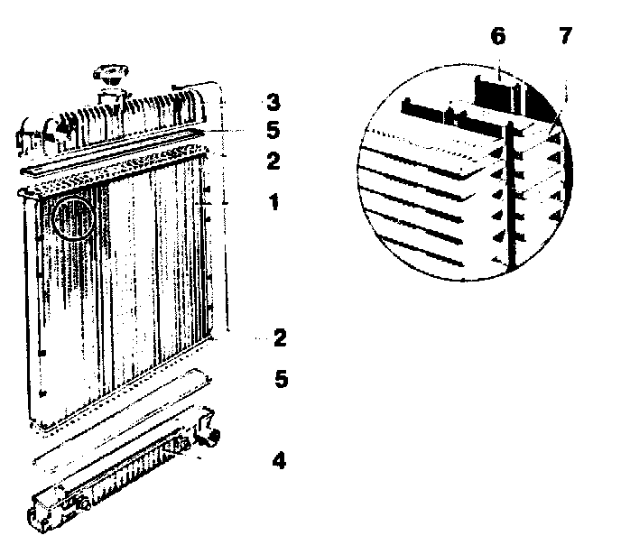 On heavy-metal radiators with plastic coolant tanks, soldering on the core may be performed only up to a distance of 20 mm from the coolant tank, as otherwise the high soldering temperature will damage the gasket (5) and the coolant tank (3 or 4). Leaks which are closer to the coolant tank should be sealed with sealing compound only.