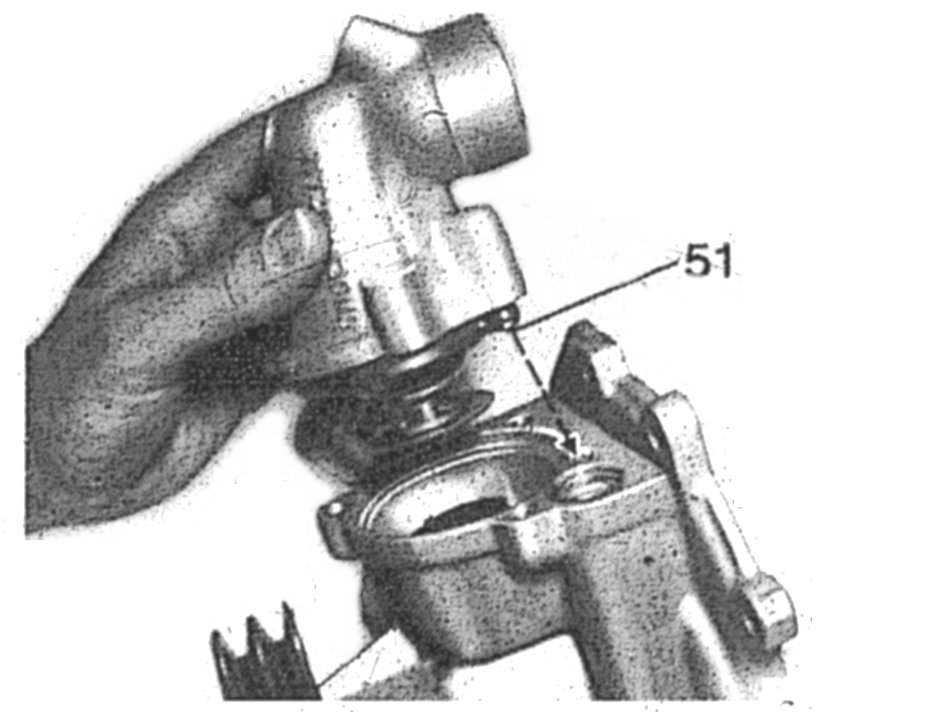 10 Install inlet connection with installed coolant thermostat in such a manner that the pin (51) engages in the control bore in the cooling pump housing (dashed arrow).