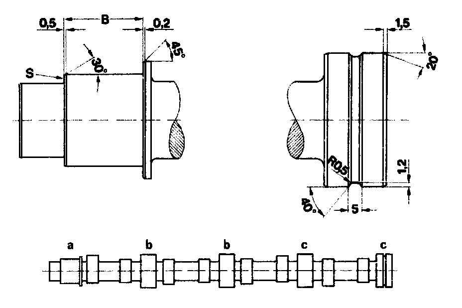 NOTE: When regrinding thrust face of bearing journal "a", grind face "S" always so that the journal width "B" and consequently the axial play (end play) is maintained.