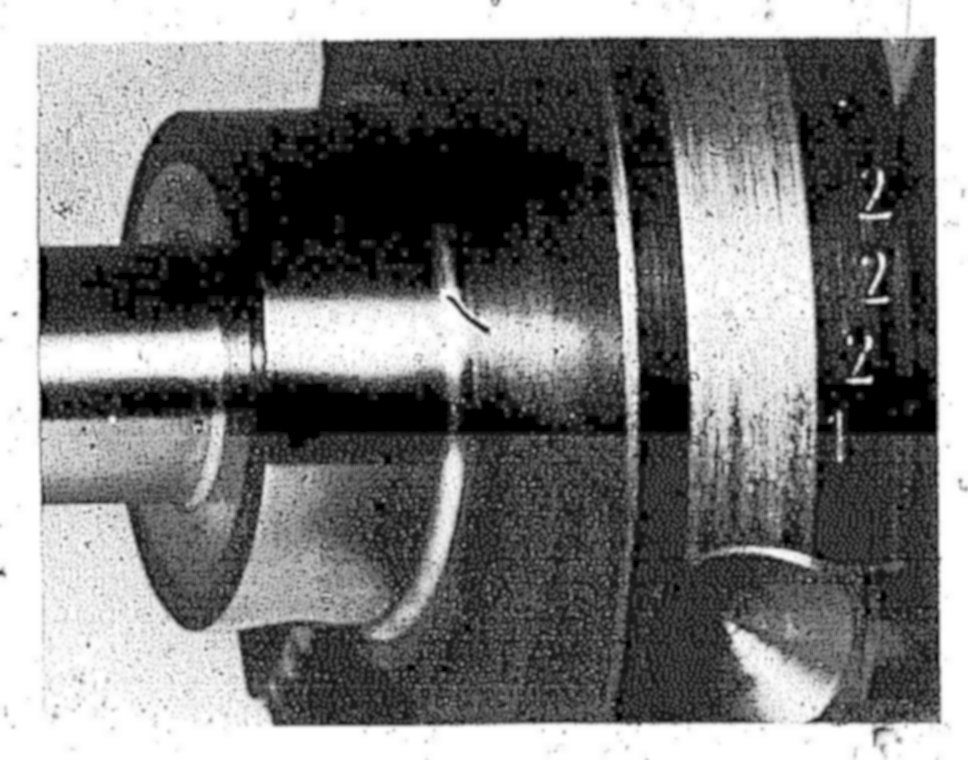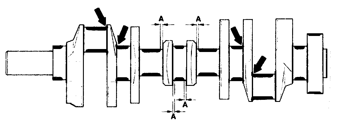 Journals and pins without hardened fillets can be inductance hardened or flame hardened. On the other hand, journals and pins with hardened fillets (arrow) must always be inductance hardened. If this is not possible, scrap the crankshaft.