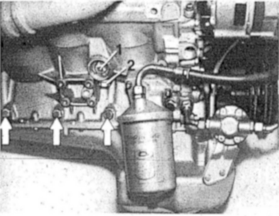 15 Unscrew exhaust manifold from exhaust pipe and cylinder head and remove. To do so, loosen engine mount (and engine shock absorber of engine 117.96) and raise slightly.