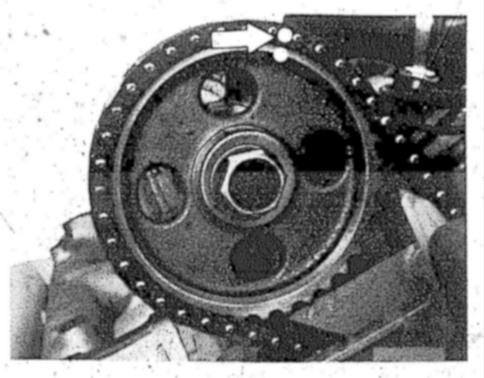 6 Mark relevant camshaft sprocket with sealing varnish together with timing chain (arrow).