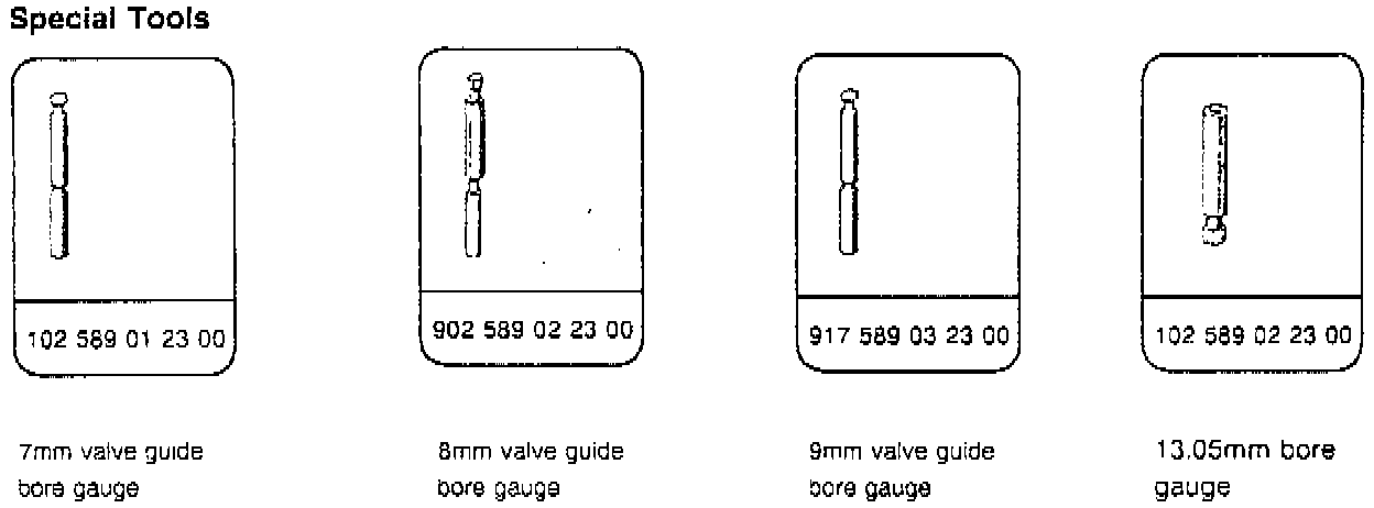 The correct special tools (Bore Gauge) for valve guide measuring, as well as for removal, must be used. To avoid damage to the cylinder head (which can result in oil seepage between the valve guide and cylinder head), refer to service microfiche, job no. 05-285 for specifications and procedures (for the procedures on engine 103, please refer to engine 102).