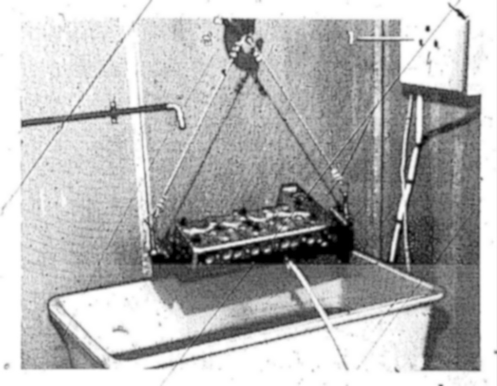 4 Fasten cylinder head on suspension device and immerse into heated water (80 °C).