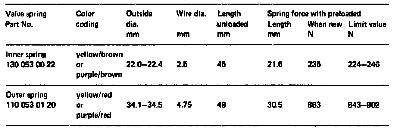 The force of the two valve springs when the engine is installed is 1147 - 1245 N for engine 116.96 and 1000 - 1245 N for engine 117.96. If this force is not achieved in the case of lowered valves (valve seat machining), place a steel washer (1.25 mm thick), Part No. 116 990 26 40, below the Rotocap (valve turning device).