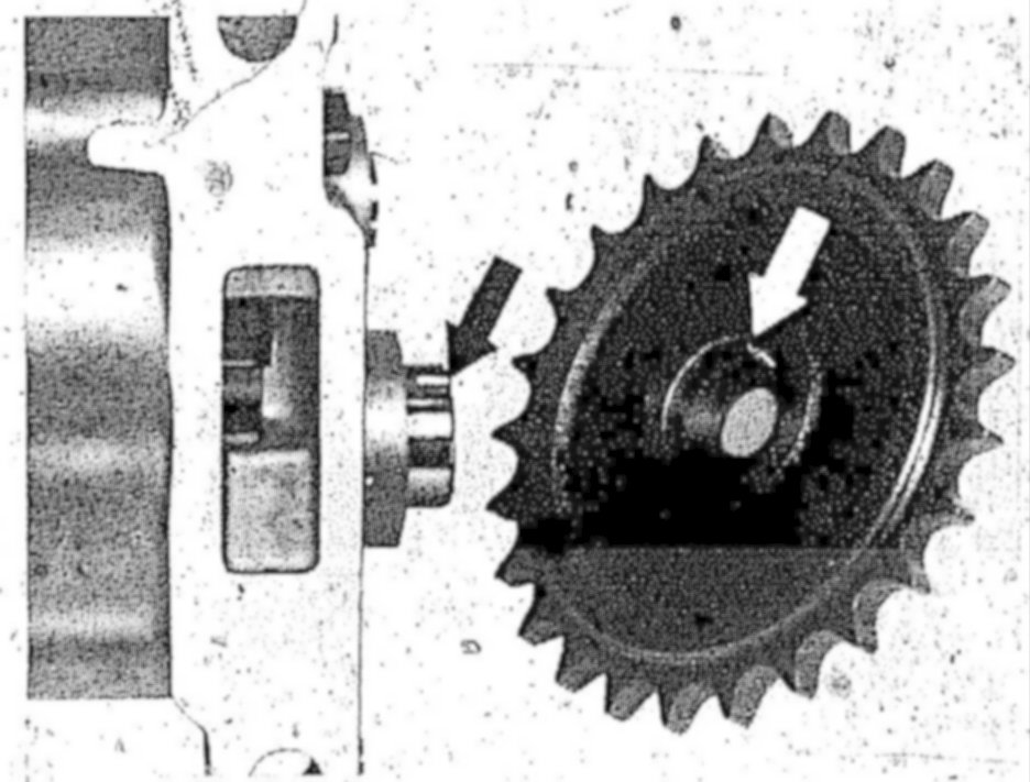 11 Push oil pump onto drive sprocket. The dowel sleeve in the drive sprocket should enter the recess in the drive shaft (arrows).