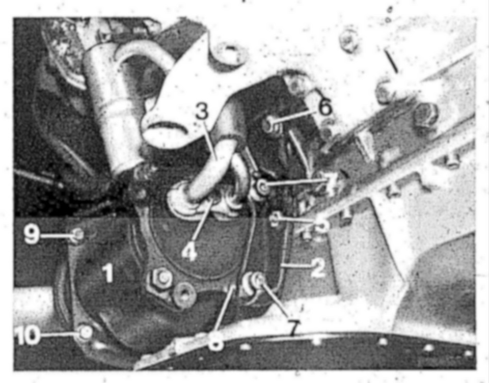 c) Tighten bolt (6) and nut (5) at side of engine.