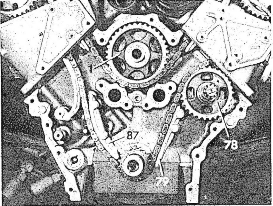 3 Slacken timing chain on intermediate sprocket (78) by turning left-hand camshaft.