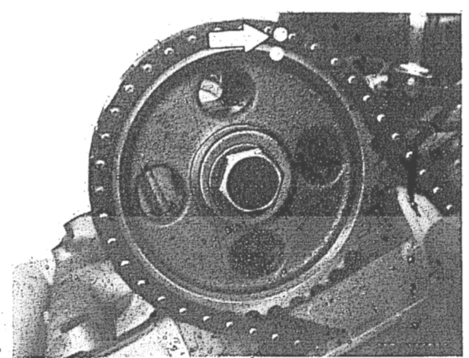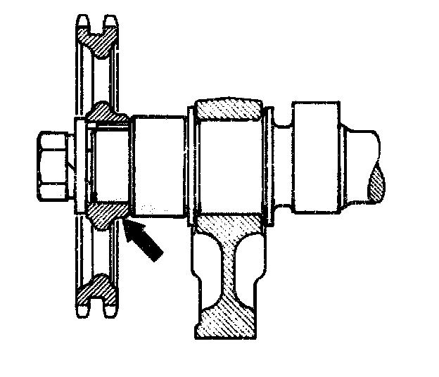 11 Mount camshaft sprocket so that the collar on camshaft sprocket (arrow) faces toward the camshaft.