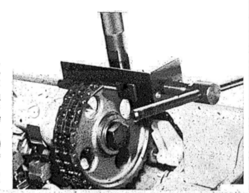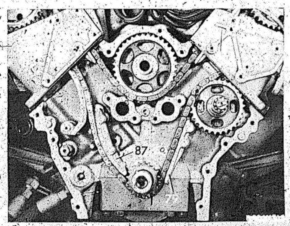 The endless timing chain is installed with timing case cover removed. Check sprockets for score marks and pitting.