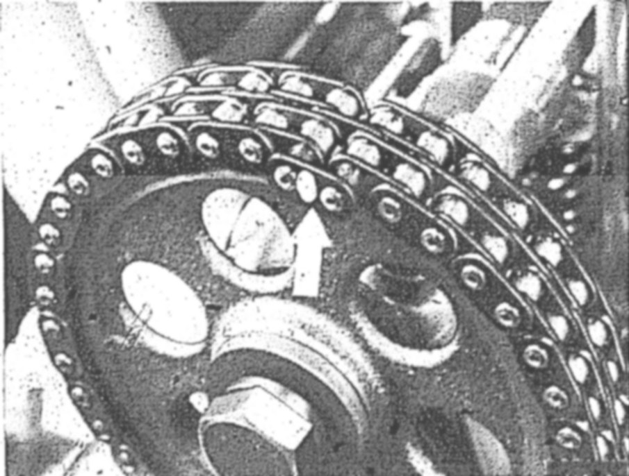 6 Slowly rotate the crankshaft by means of tool combination in the direction of rotation of engine while simultaneously pulling up the old chain until the connecting link comes to rest against the upper-most position of the right-hand camshaft sprocket.