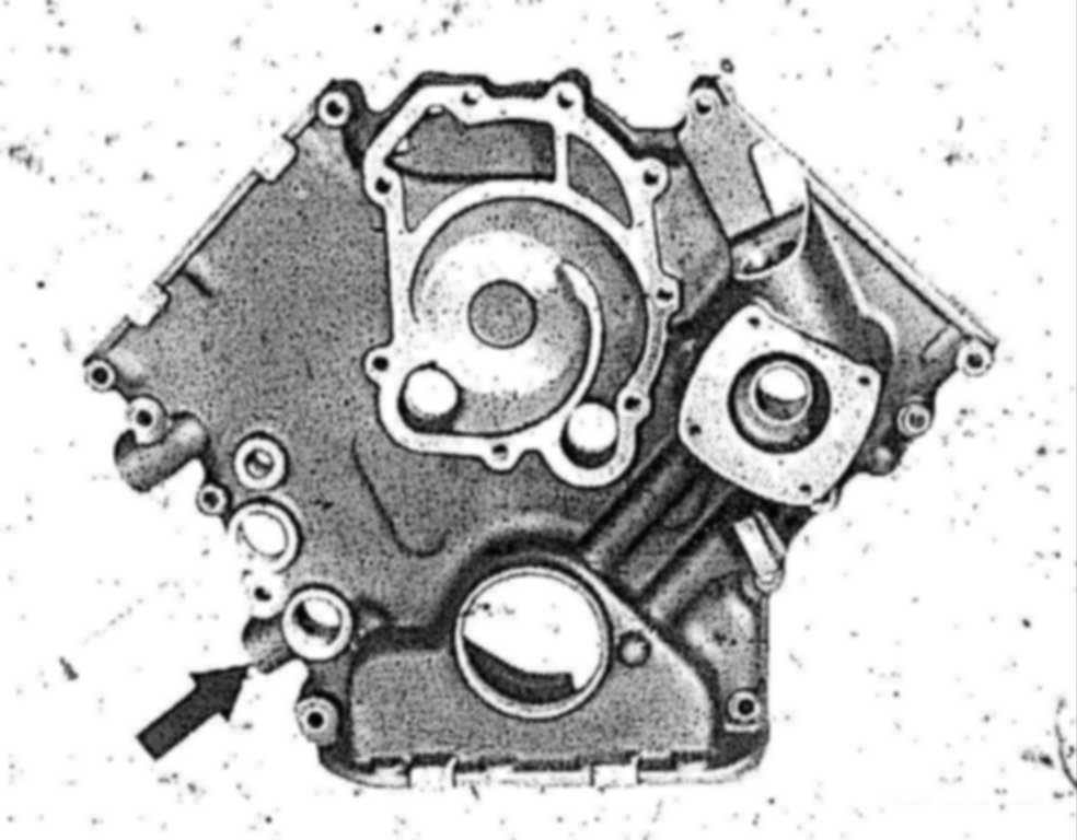 The thread (arrow) for the temperature switch (turbocharged engines only) has been modified from M 16 x 1.5 to M 14 x 1.5 at the timing case cover of engines without oil cooler.
