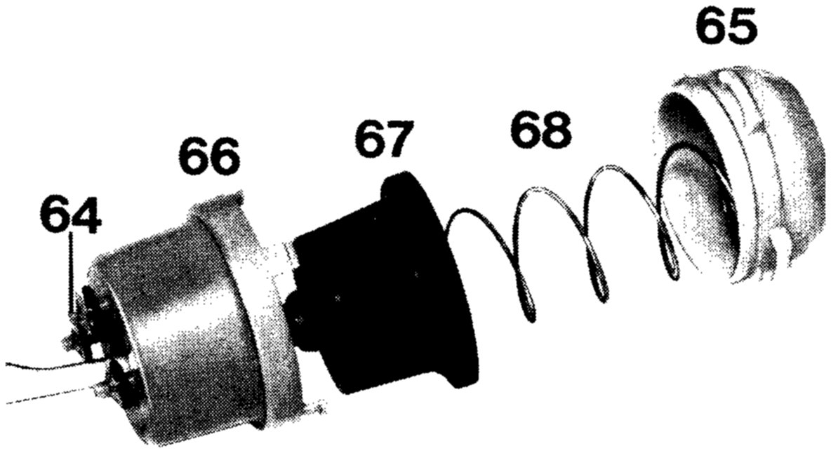 9. Carefully remove housing top (65) from housing bottom (66), remove spring (68) and sleeve (67).
