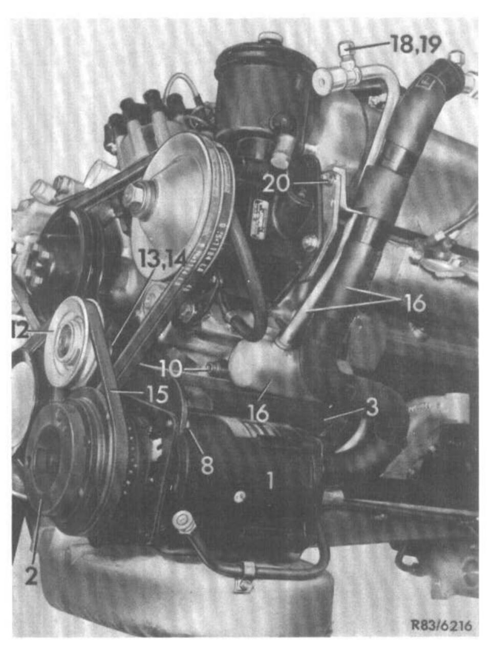 Note: Check alignment of pulley - compressor in relation to pulley - crankshaft and tensioning roller and correct with compensating washers (14) between tensioning roller and refrigerant compressor carrier, if required.