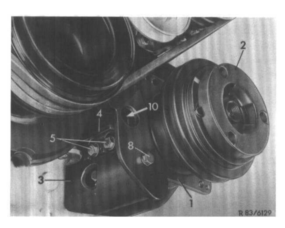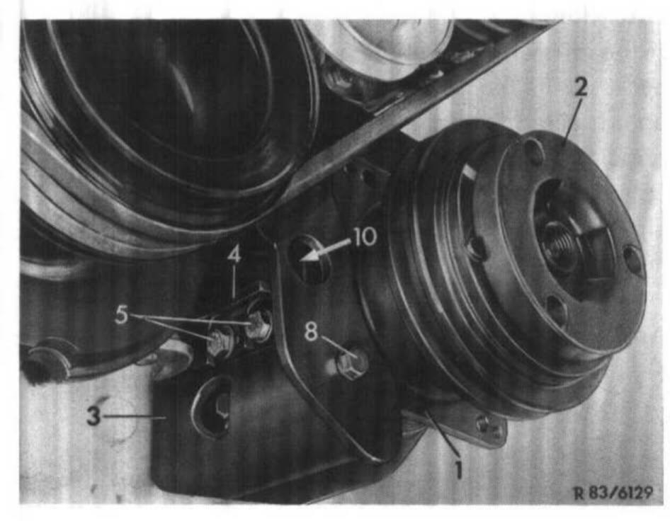 10 Unscrew two screws (11) on refrigerant compressor carrier (3) rear, as well as two screws (10) on engine face.