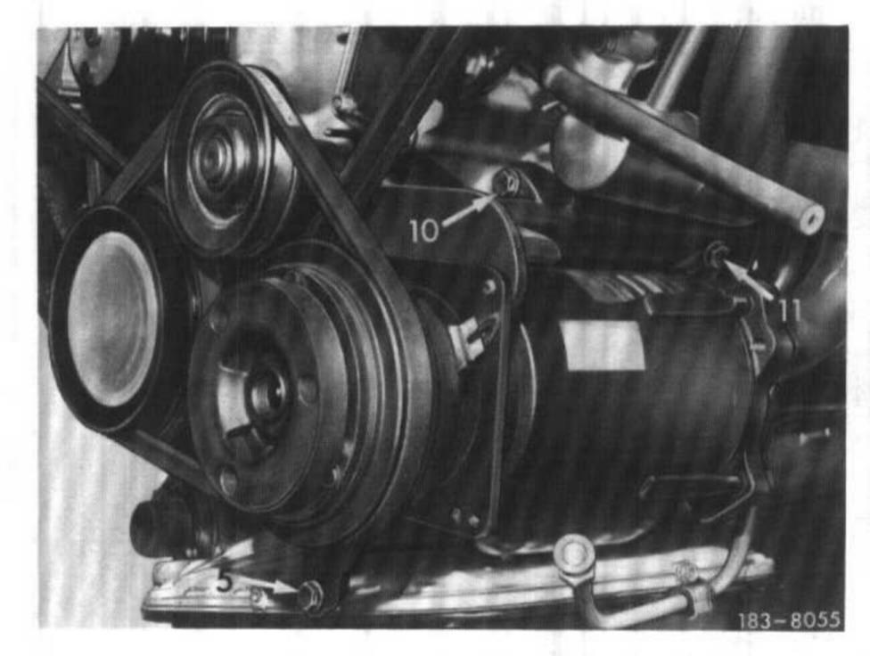 19 Install refrigerant compressor with refrigerant compressor carrier. Screw to cylinder crankcase and to supporting angle (4) or to oil pan upper half (with parts items 5, 10 and 11).