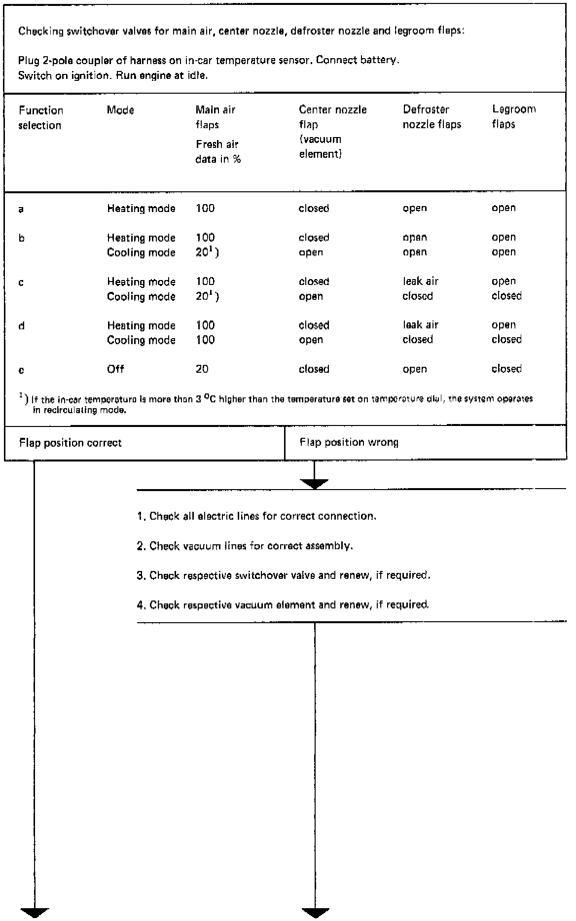 CHECKING SWITCHOVER VALVES FOR MAIN AIR, CENTER NOZZLE, DEFROSTER NOZZLE AND LEGROOM FLAPS: