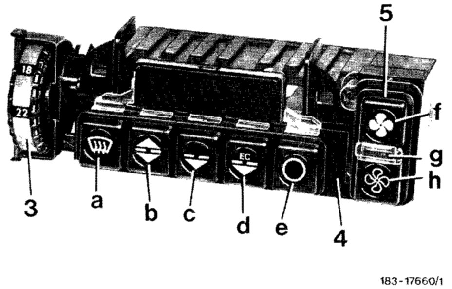 12. Check cutout temperature of Evaporator Temperature Regulator (ETR) switch (29) by plugging 1 thermometer into center nozzle. Push blower switch (h) 1st stage and pushbutton (c) in control unit and run engine at approx. 2000/min. After 3rd cutout of electromagnetic clutch, the outlet temperature should amount to approx. +4°C, but should not be < +3°C.