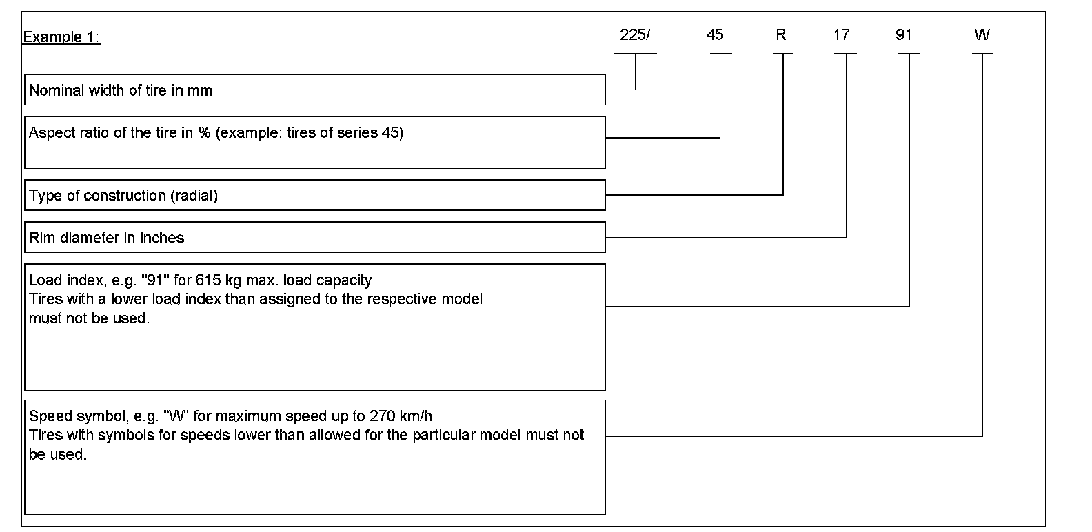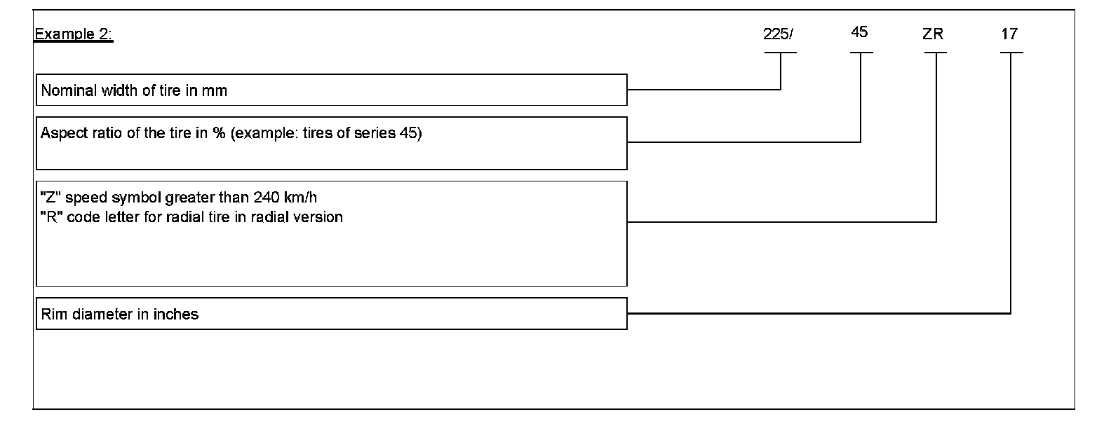 For the designation of tires as per ECE directive, with the exception of ZR tires (see example 2), the speed symbol for the permissible maximum speed is specified after the tire size.