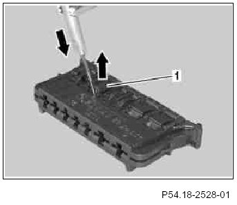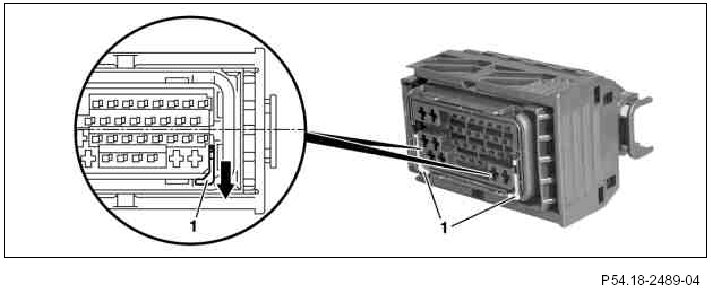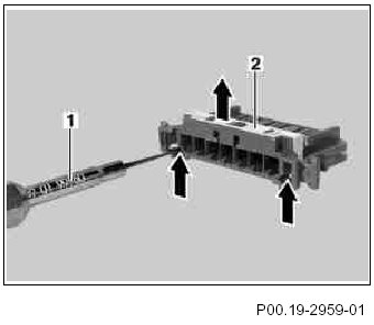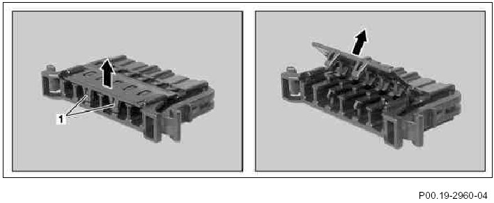 8 Using a suitable tool, move both sliding plates (1) in housing in direction of arrow over catch mechanism.