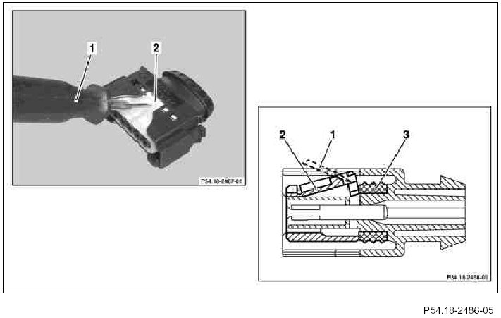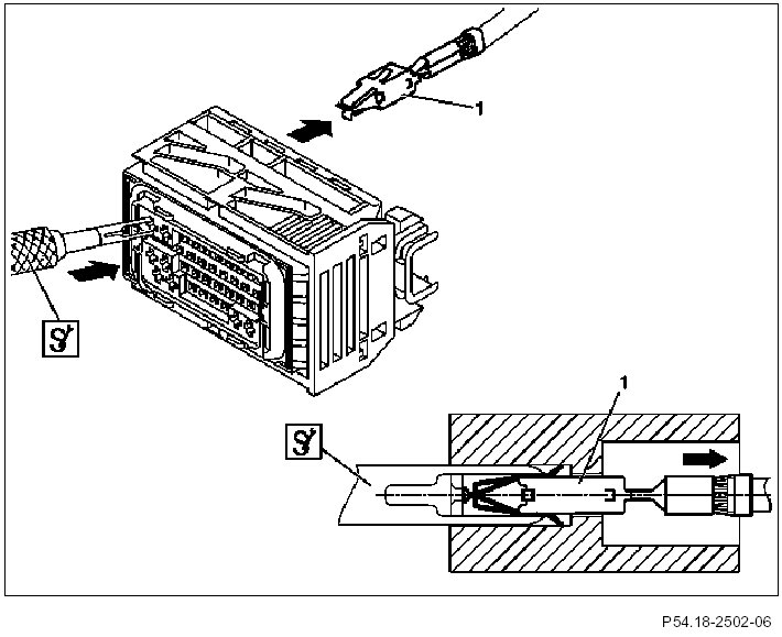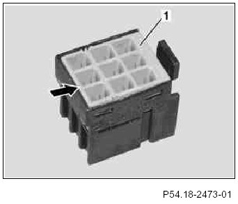 9 Using a suitable tool, move contact retainer (1) in direction of arrow out of locked position.