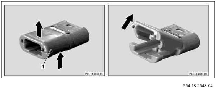 2 Using a suitable tool, pry up the side tabs of the retaining clamp (1).