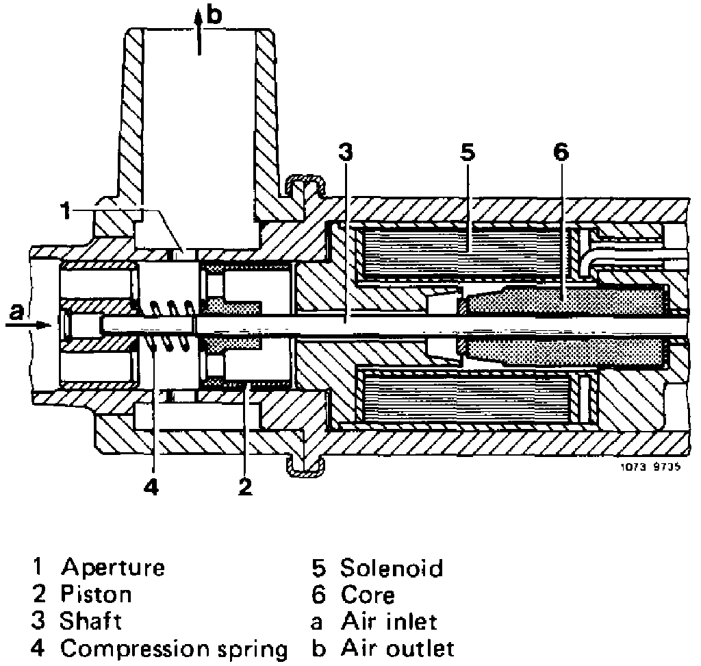 The idle speed adjuster is a lifting magnet with respective aperture which permits variation of air flow rate. The control unit provides the lifting magnet with a timed direct current in frequency range of approx. 200 Hz.The air is picked up after the air flow sensor plate, but before the throttle valve. The respective air quantity will be combined with the respective fuel quantity via the air flow sensor plate.