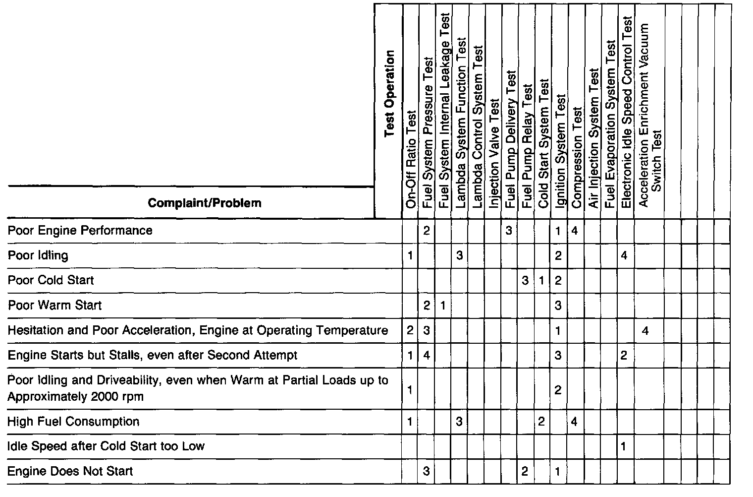 Find the Complaint/Problem in the left column of the chart. Perform test(s) sequentially as indicated by the numbers. Test No. and Test Operation are given across the top of the chart. The numbered order indicates the test priority. Click on the numbered step to go to the applicable test procedure.