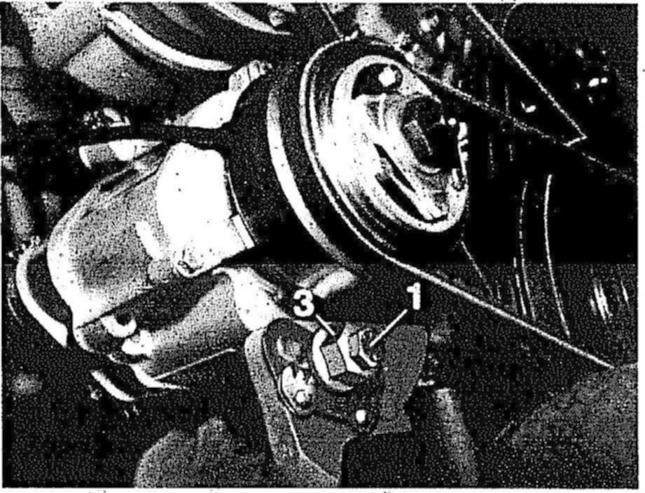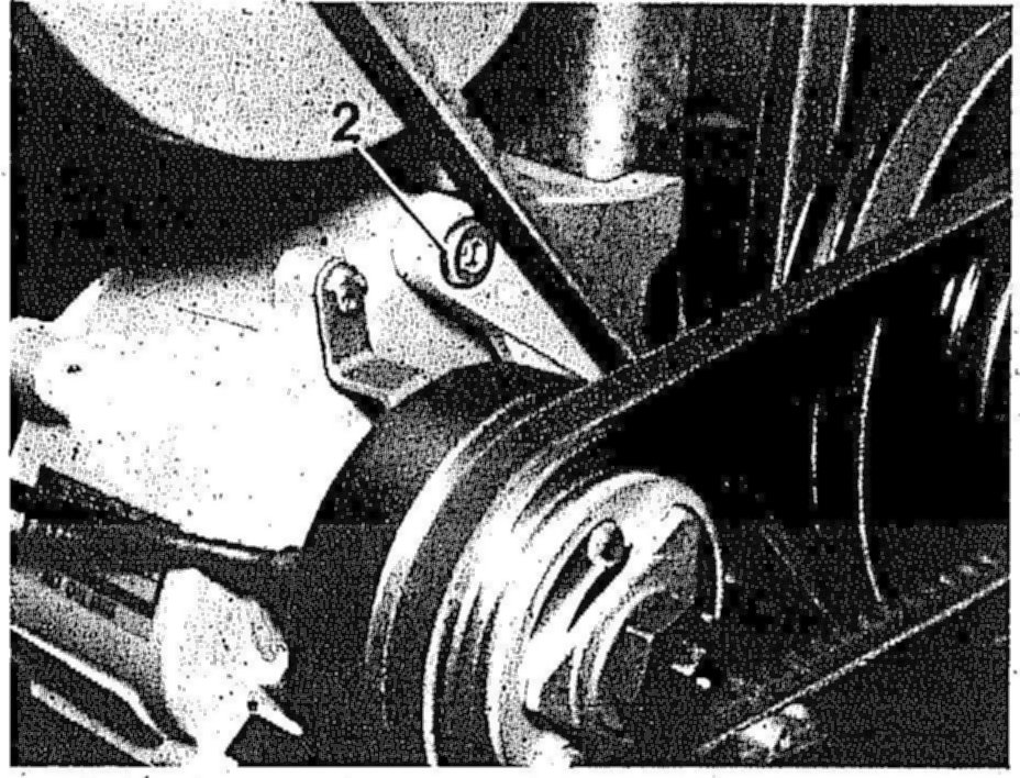 6 Tension V-belt with tensioning wheel (3) and tighten fastening screws (1 and 2).