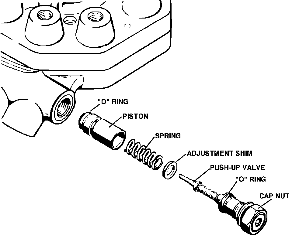 The fuel pressure regulator, Fig. 4, is located in the fuel distributor. It accurately maintains supply pressure at 4.5 - 5.2 bar by the use of an adjustable, spring loaded plunger. The valve is matched to the regulator bore and is non replaceable, but can be removed for "O"-ring replacement. Severe blends of gasohol can damage these "O"-rings.