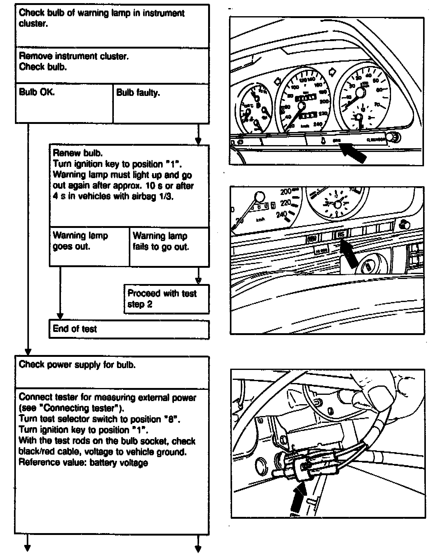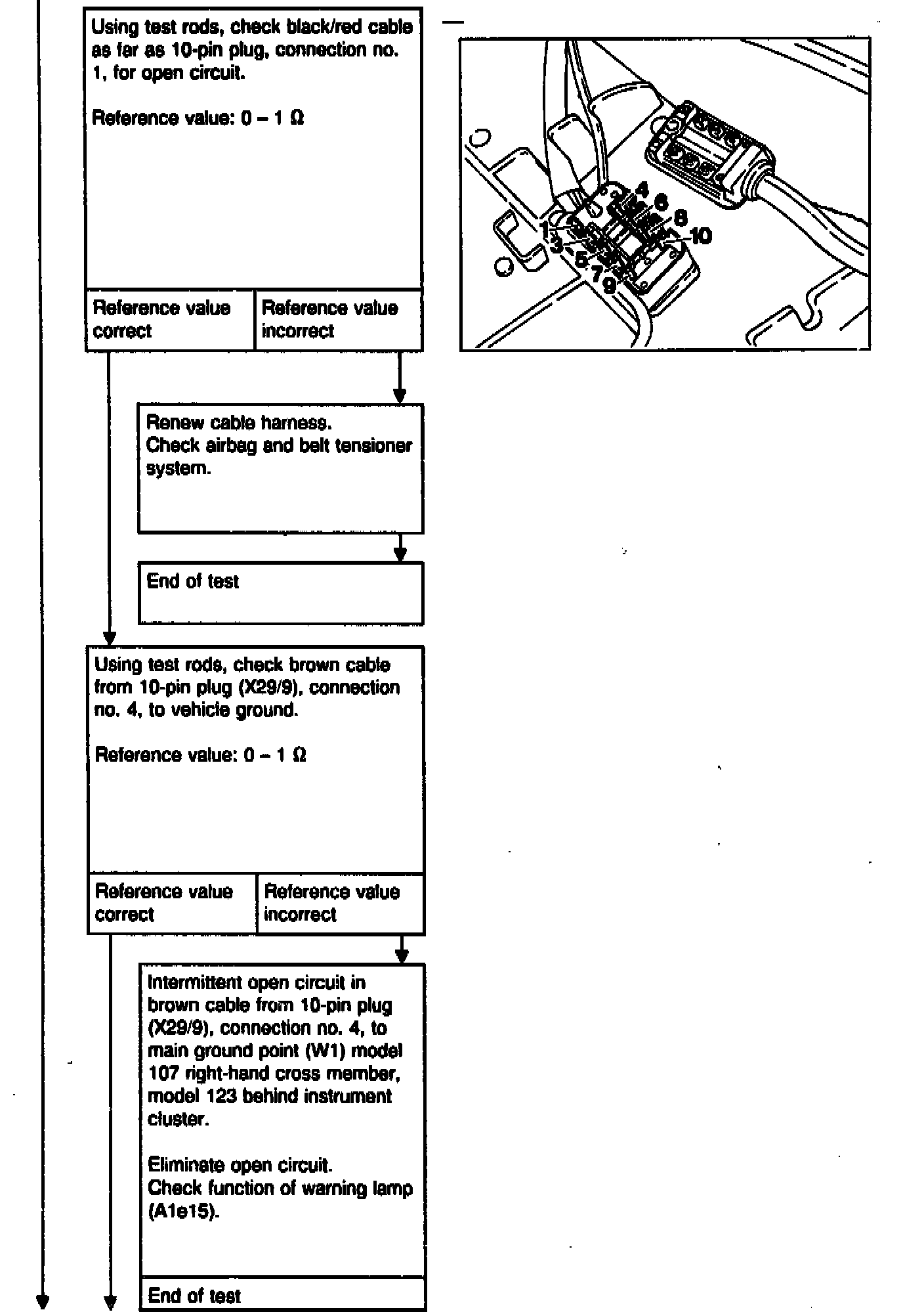 If, after turning the ignition key to position "1", the warning lamp lights up but fails to go out again within 10 s or approx. 4 s in vehicles with airbag 1/3, or flickers intermittently during driving, proceed as follows..