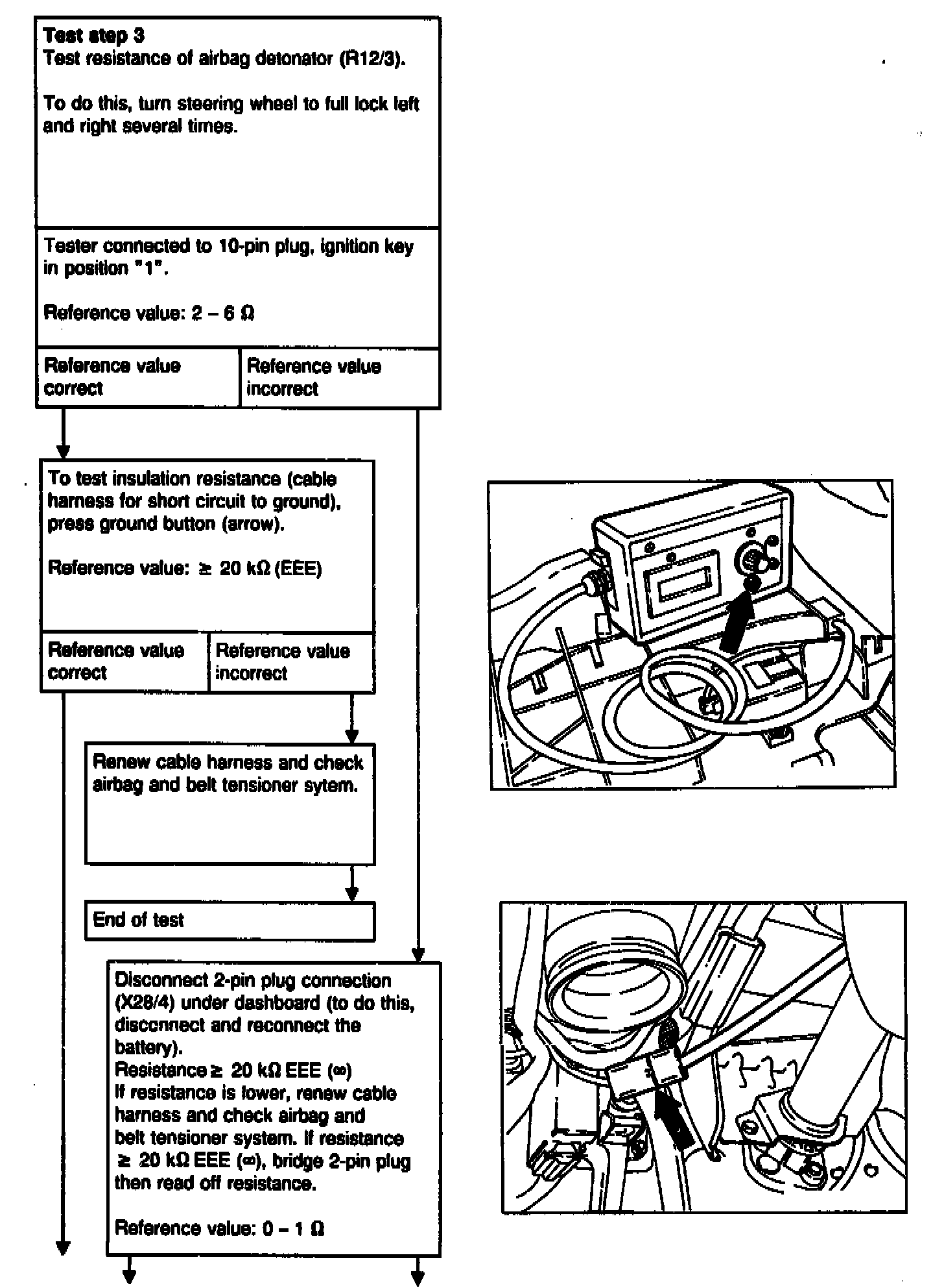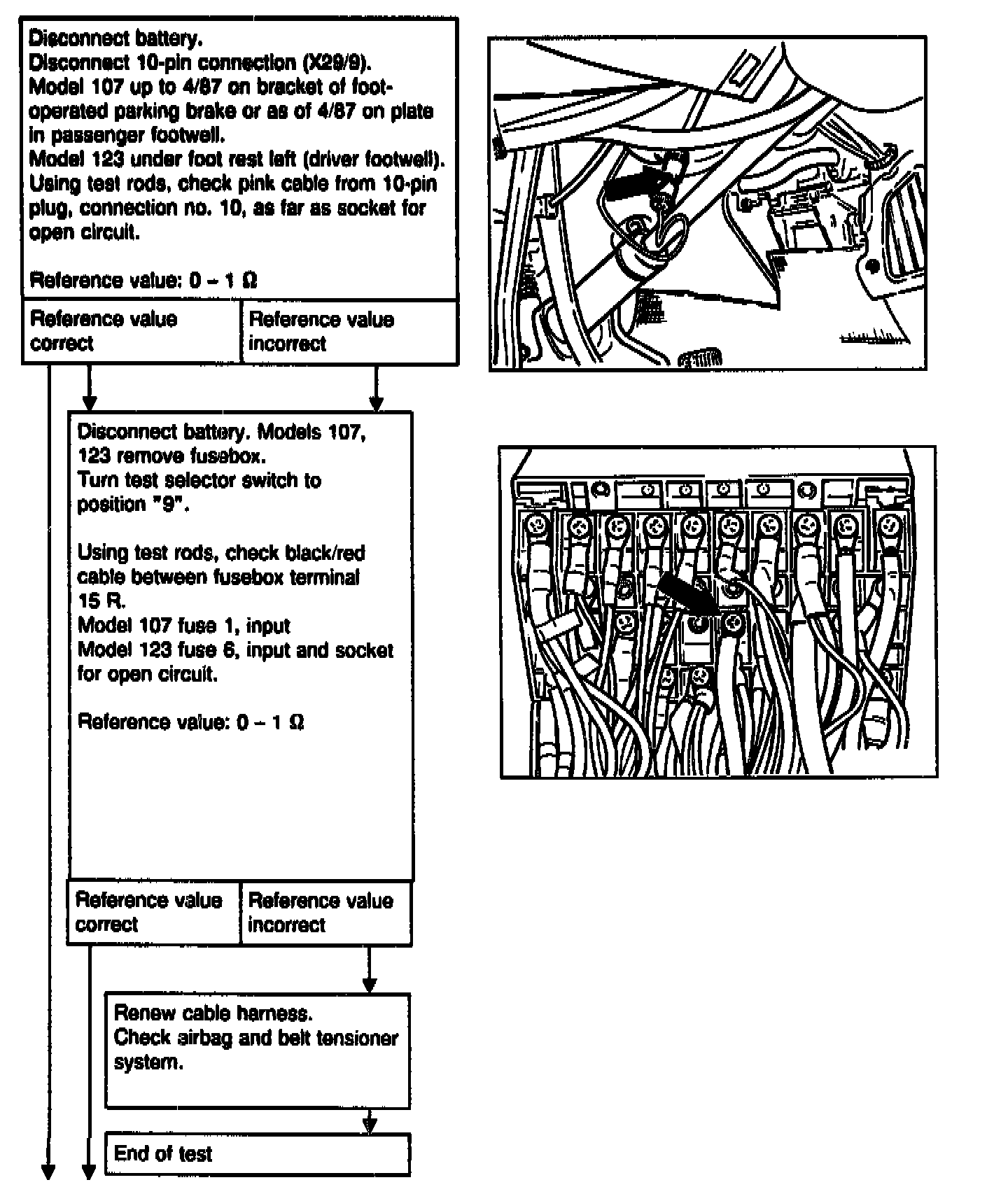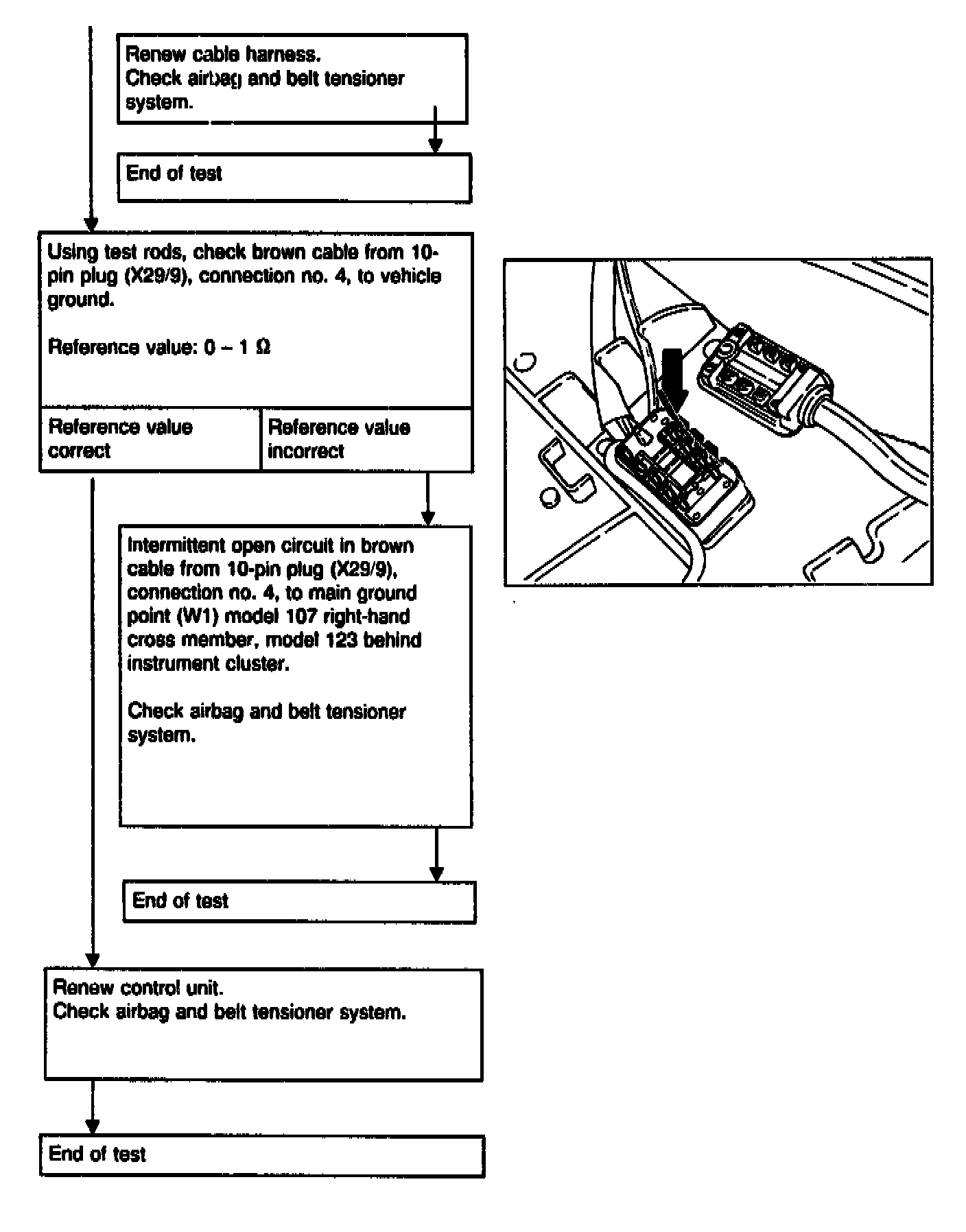 WARNING: Each time before disconnecting the red test coupling/plug connection for airbag, 10-pin (X29/9), to connect the tester, the ignition key must be turned to position "0", the negative terminal of the battery disconnected and covered. Then reconnect the battery for the test.