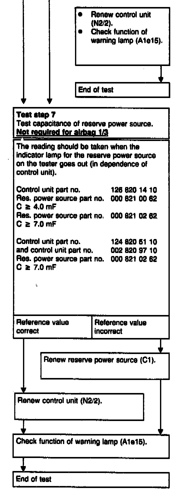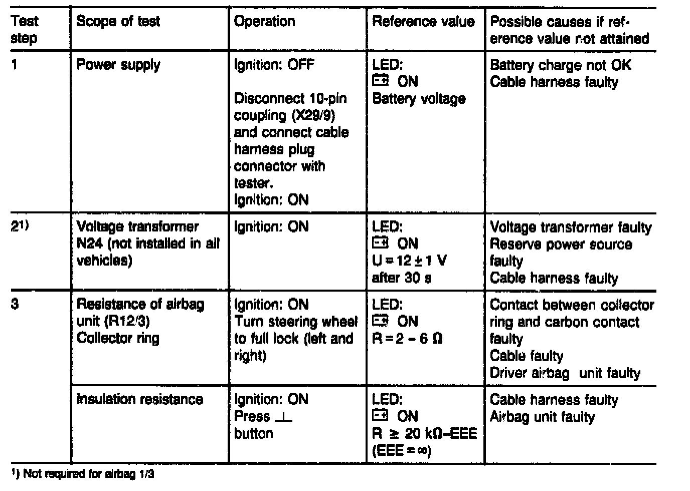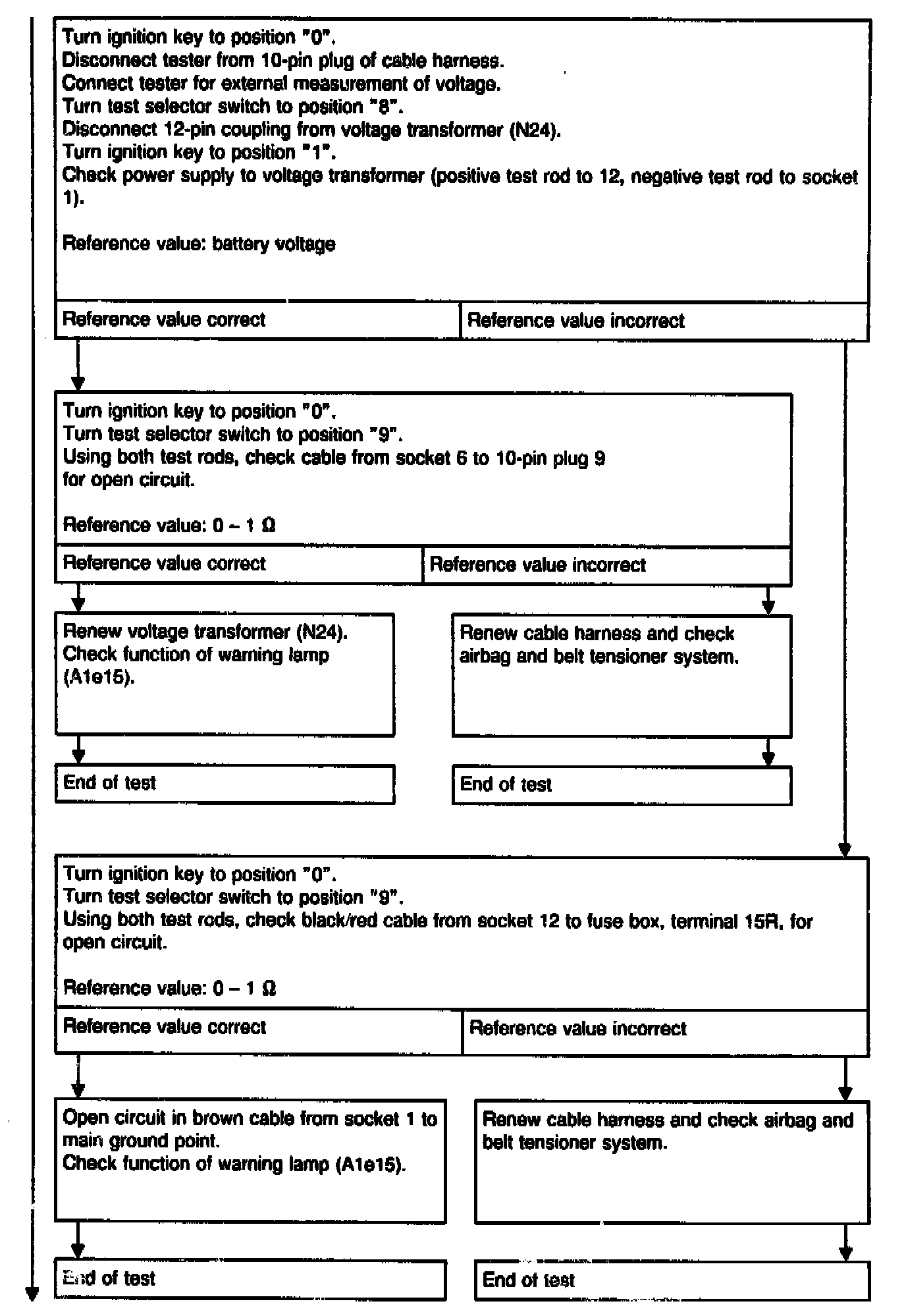 Before testing with the tester, the airbag restraint system must be tested by means of the RS/SRS warning lamp (A1e15). With the ignition switched on, the RS/SRS warning lamp should light up for approx. 10 s, or approx. 4 s in vehicles with airbag 1/3. If necessary, check warning lamp or cable.