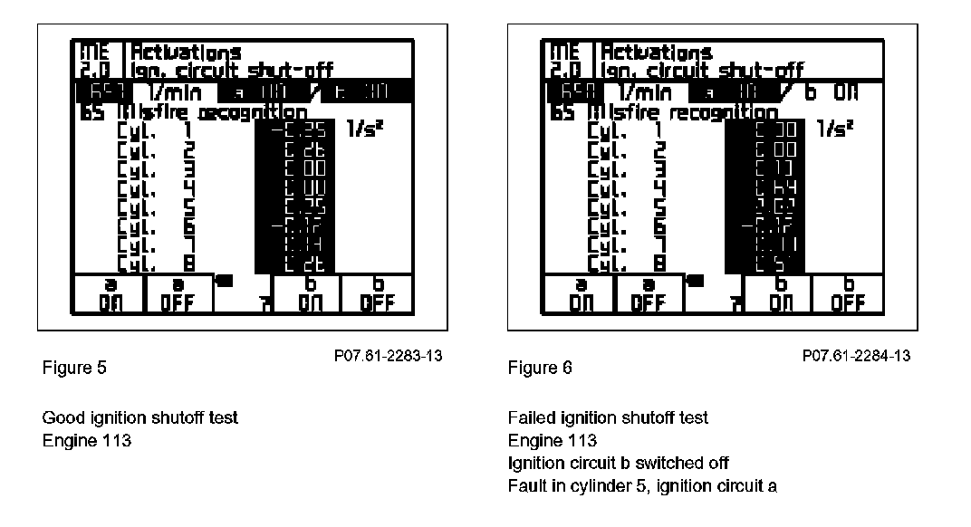 The cylinder balance test must be performed at idle. If the misfire recognition shutoff threshold is exceeded, a fault will be stored and at the same time the fault count will increases. After repairs, clear the diagnostic memory.