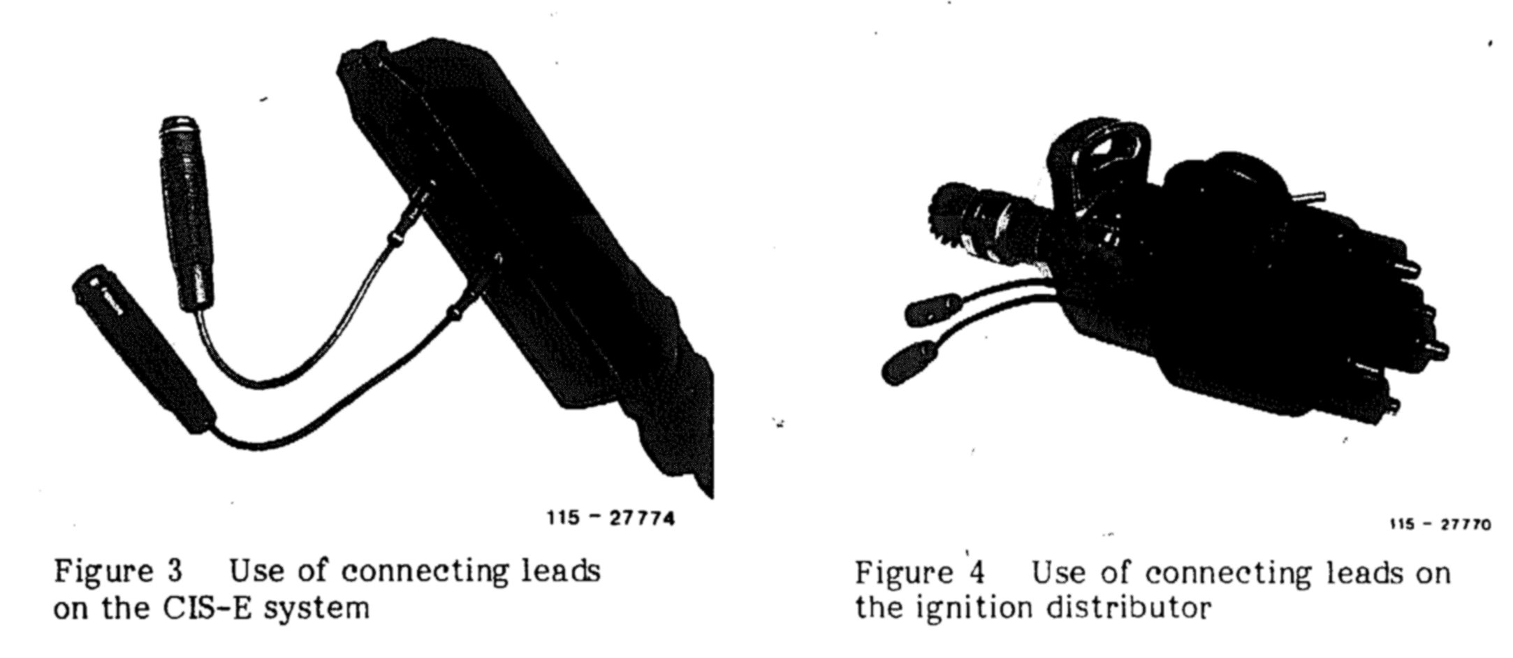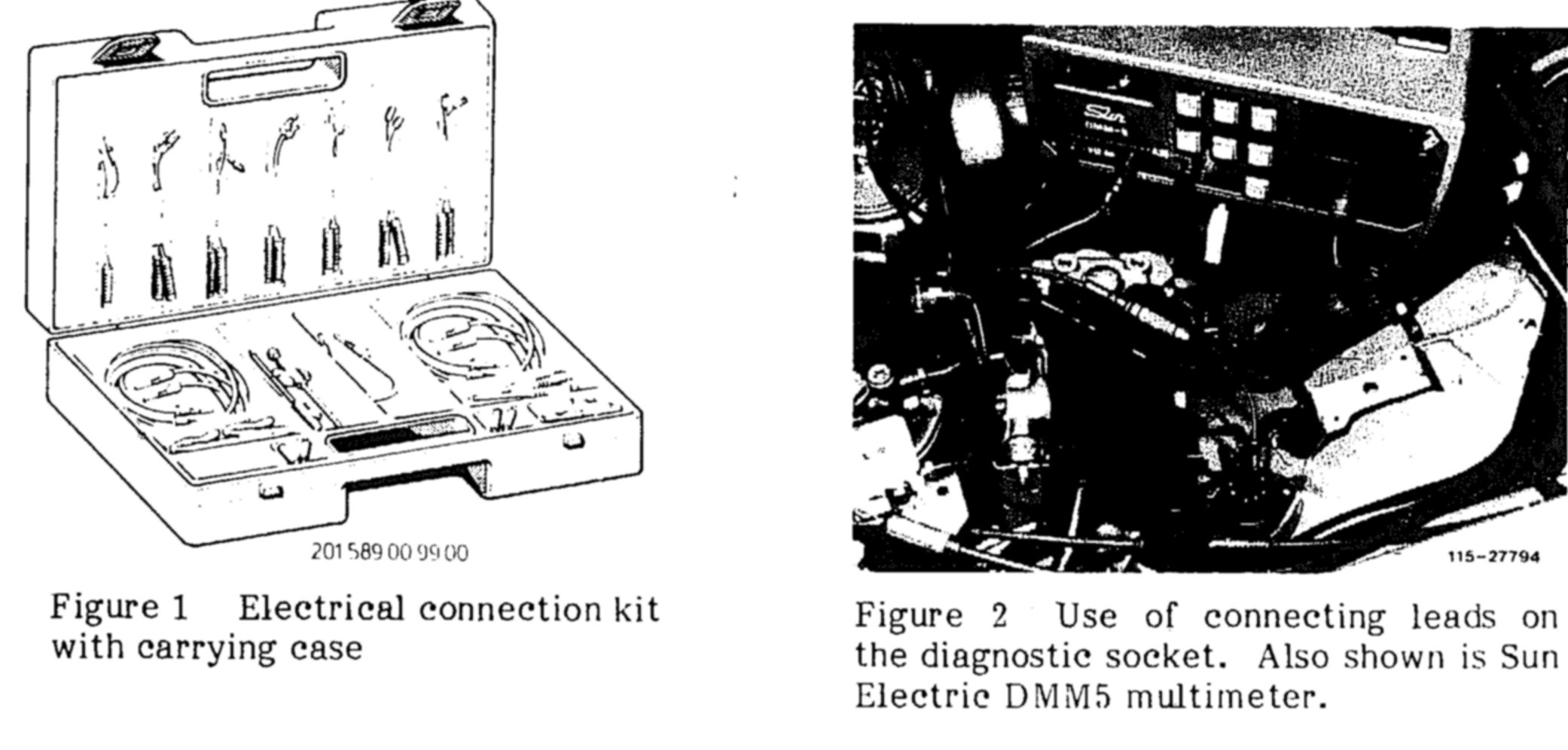 As an aide for making measurements in the vehicle electrical system, electrical connection kit (tool no. 201 589 00 99 00) is now available. It includes connecting leads for various types of connectors (both flat and cylindrical) used in Mercedes-Benz cars. Also included are jumper wires and universal leads, as well as various clips and test probes. Some of the uses and individual parts of the set are shown in the figures.