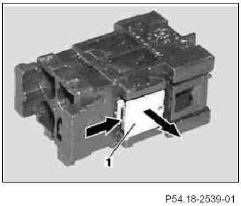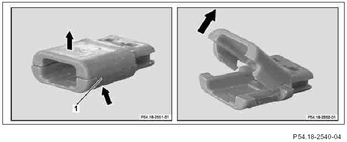 3 Using a suitable tool, pry up the side tabs of the retaining clamp (1).