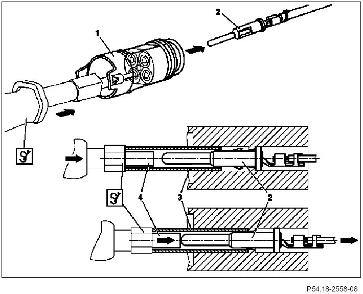 2 Press contact pin (2) from its seat in housing using plunger (4) on release tool with RK 1.5 ejector against spring force of tool.